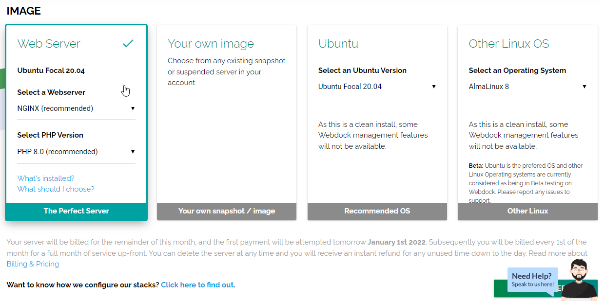 - Click the big red "plus" button top right, enter a name for the server (will form part of the server subdomain by default), select SSD Bit "Starter Box" size in Europe and then "The Perfect Server" image